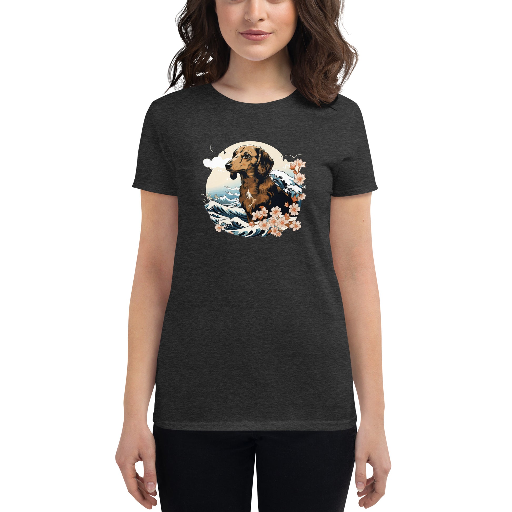 Experience paradise in our "Hawaiian Collection" women's shirt, adorned with unique dog breed artwork, steeped in Hawaii's lush tropical imagery. Inspired by Hokusai's iconic "Great Wave off Kanagawa," each shirt weaves a vibrant tale of canine delight amidst tranquil Hawaiian backdrops. A wear-anywhere piece, it captures the essence of the islands and the charm of your favorite dogs in one dynamic, visually stunning garment. Dive into style, comfort, and the aloha spirit!Heather Grey is 90% cotton and 10% polyester for a softer slightly stretchy feel. Dark Heather Grey, Heather Green, and Heather Blue are 35% cotton and 65% polyester. The others are 100% cotton. The shirt is pre-shrunk to maintain size through multiple washes.